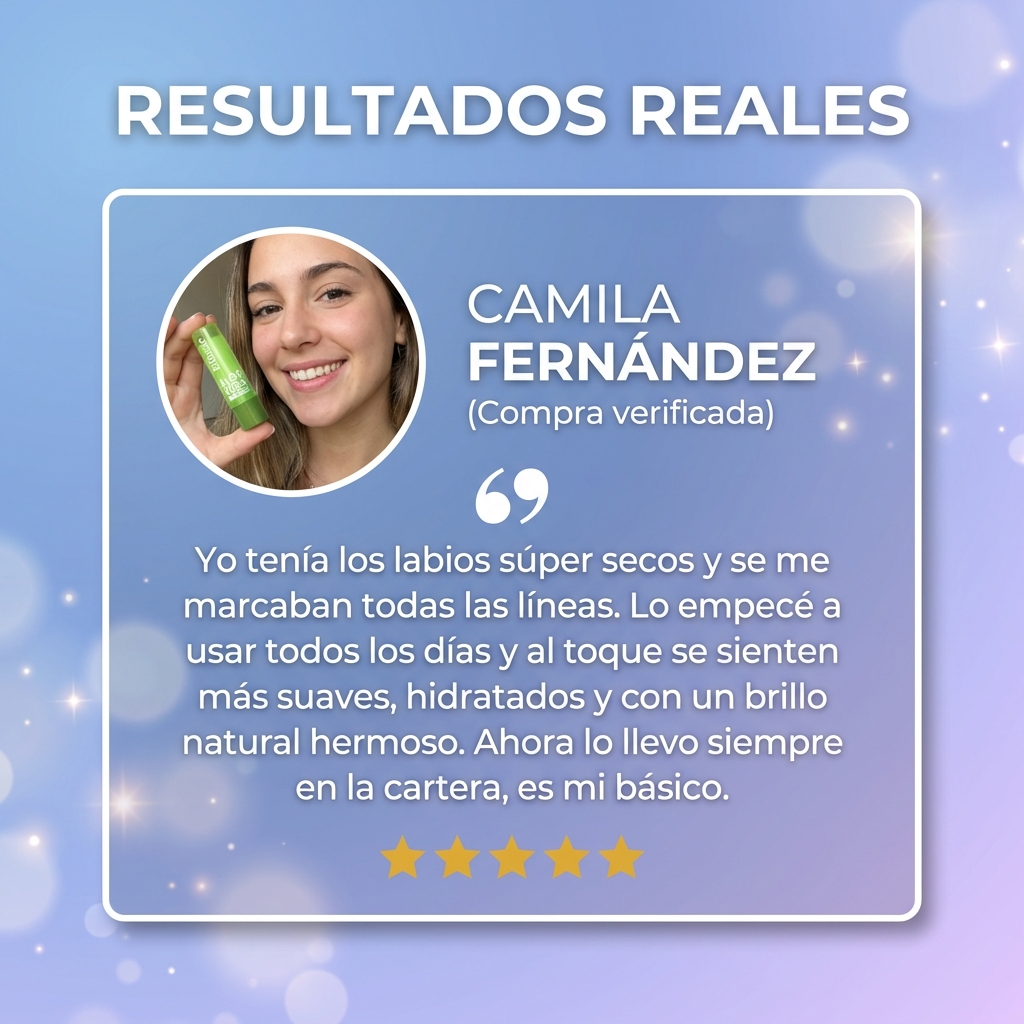 Sofía M. — PalermoComprador Verificado“Tenía los labios súper resecos por el mate y esto me los deja suaves al toque. Lo llevo siempre en la cartera.”